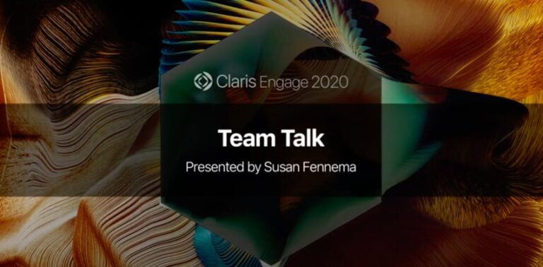 Susan Fennema spoke at Claris Engage 2020 on the topic of being a leader. Full transcript included in a video entitled, Team Talk.